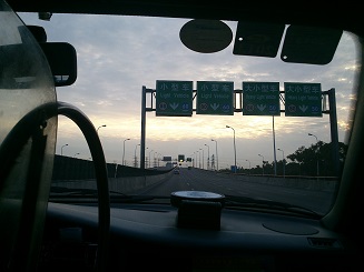 朝焼けを見ながらタクシーに乗りました